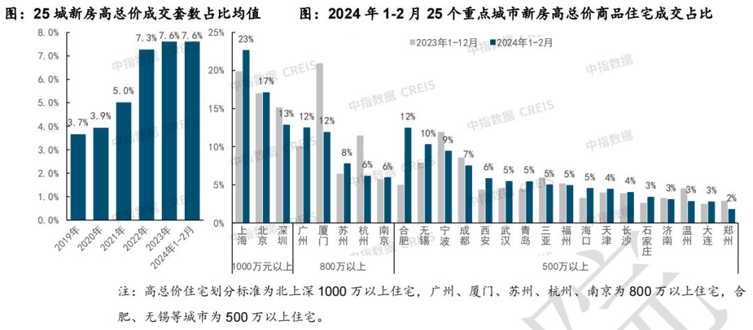 据中国指数研究院统计,今年 1-2 月重点25城新房市场高端改善项目成交套数占比均值较2023年同期提升0.8个百分点,与2023年整体持平。