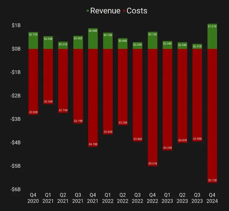 扎克伯格曾表示,Reality Labs要到2030左右才能实现盈利,然而近些年,该部门的亏损越来越大,去年全年亏损达161.23亿美元,今年看似将亏得更多。