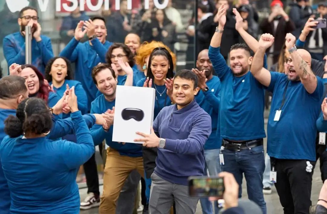 时间回到两个月前,苹果CEO蒂姆·库克亲临纽约曼哈顿第五大道苹果旗舰店,与员工们一起欢迎首批购买Vision Pro的用户。