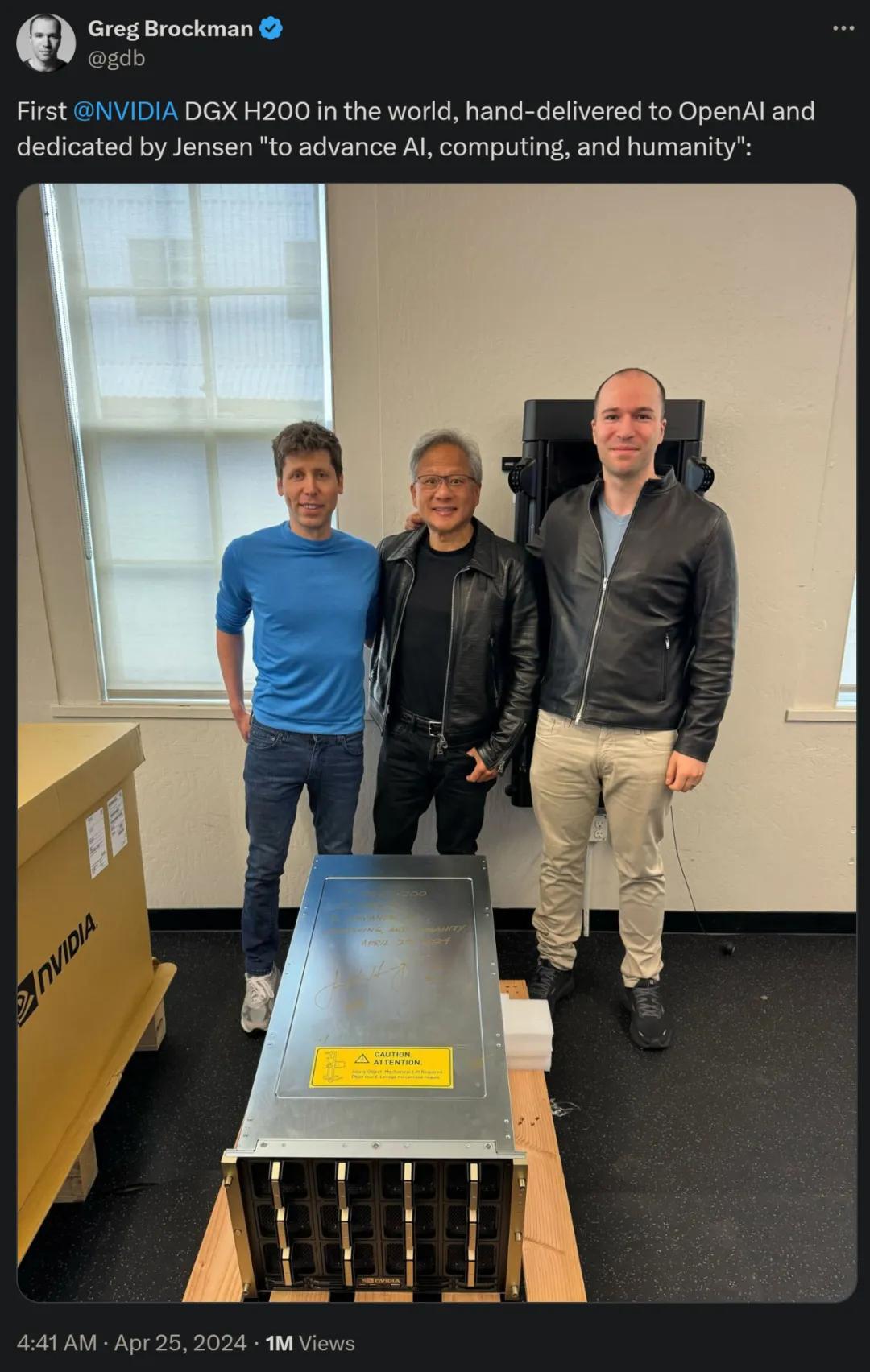 昨天,黄仁勋亲自为 OpenAI 送来了全球第一台 Nvidia DGX H200 超级计算机,三人合影(老黄、奥特曼、Greg Brockman )引得大家津津乐道。