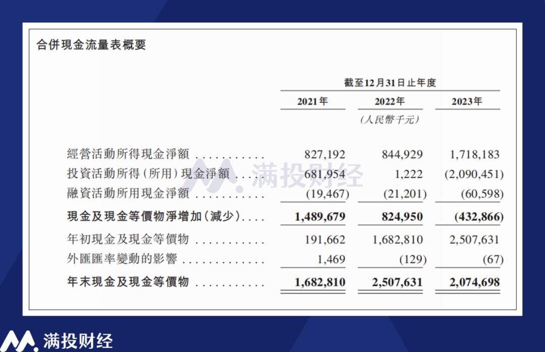 截至2024年3月,公司在手现金以及现金等价物为20.75亿元,较2022年末减少4.32亿元,主要是由于公司投资活动所用现金金额在2023年达到了20.9亿元。根据招股书,公司投资活动的现金变化主要来自于以公允价值计量且变动计入当期损益的金融资产,包括被出售的金融资产在内总计造成约11.7亿人民币的流出。