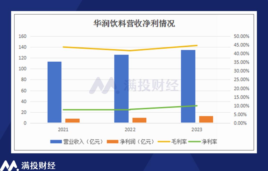 具体来看财务,根据招股书数据显示,2021年-2023年期间,华润饮料分别实现营业收入113.40亿元、126.23亿元、135.15亿元,其中2022年、2023年营收增速分别为11.3%,7.1%,短期增速稍有下滑。2021年-2023年期间,公司销售毛利率分别为43.8%、41.7%以及44.7%,毛利率近年波动提升;净利率方面,2021年-2023年,公司年度净利润率分别为7.6%、7.8%以及9.9%,净利率有明显上升趋势。