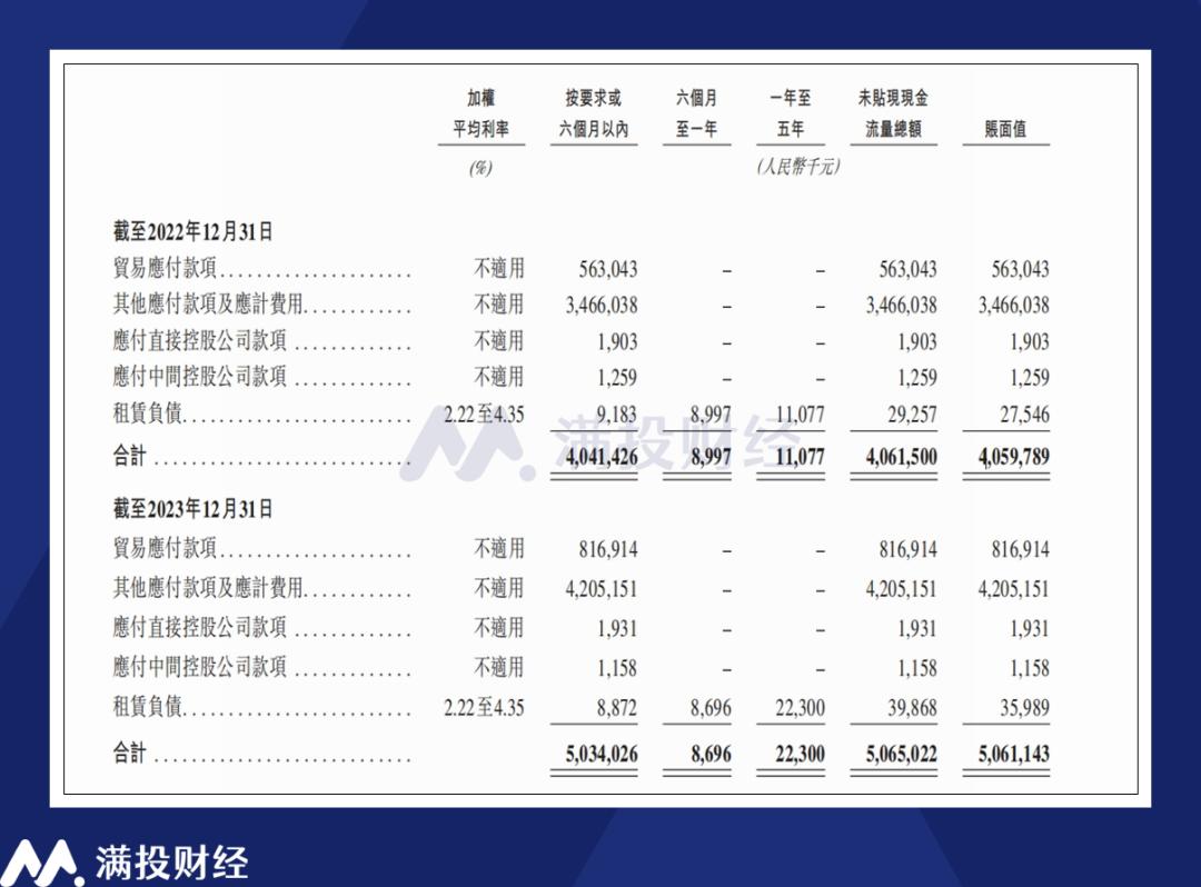具体来看,根据公司招股书披露的流动风险,截至2023年12月31日,公司需要在六个月内偿付的应付款项以及费用达到50.34亿元,占流动负债总额的97%。而正如前文所言,公司在手现金仅有20亿左右。尽管短期的负债根据实际情况或许还有延长的机会,但整体来看,公司当前面对的流动性危机算得上比较严重的。