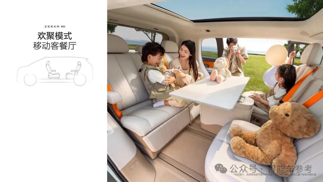 比如欢聚模式下,前排座椅后转180度,四人可对坐,再加上可拓展桌板,座舱变“移动客餐厅”。