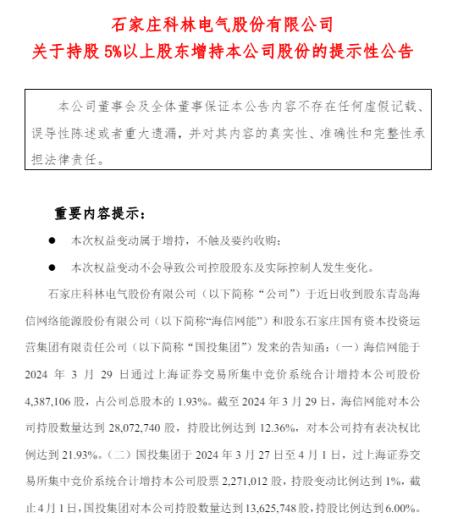 另一方面,4月2日晚科林电气发布的公告中,除了说明海信网能所持股份变动情况,同时也披露石家庄国有资本投资运营集团有限责任公司(以下简称“石家庄国投”)于3月27日至4月1日增持情况,截至4月1日,石家庄国投对公司持股数量达到1362.57万股,持股比例达到6%。