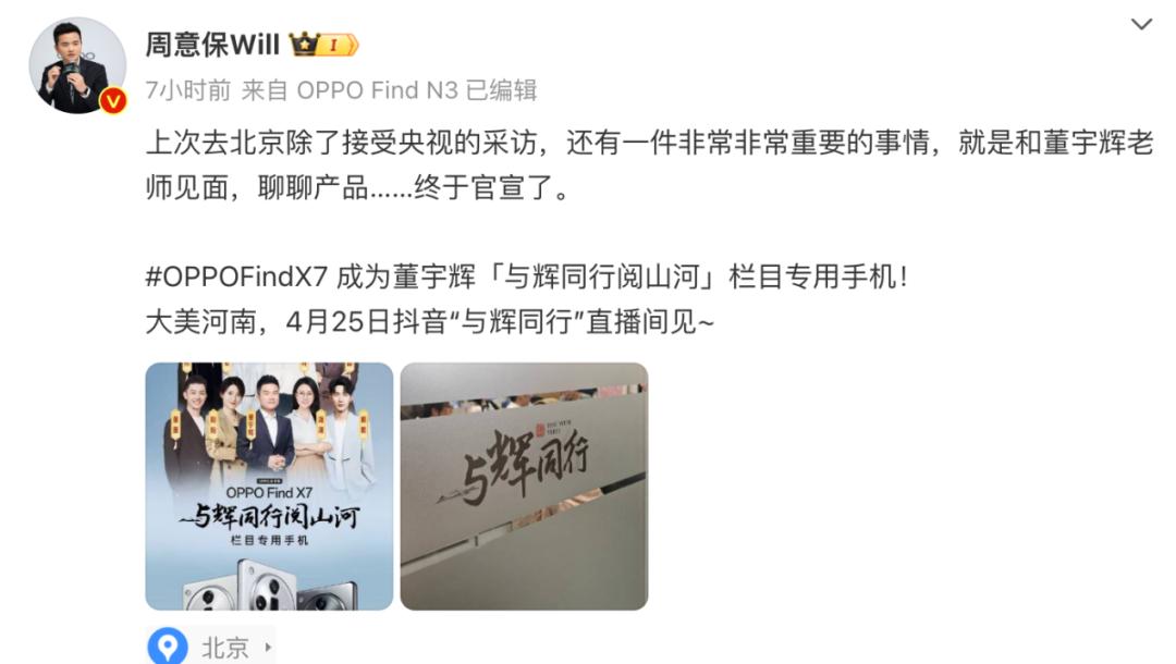 除了车企,此次赞助董宇辉直播间的还有手机品牌OPPO。微博认证为OPPO Find系列产品负责人的周意保,早在直播前一天就发文称,和董宇辉老师见面,聊聊产品,终于官宣,OPPOFindX7成为董宇辉“与辉同行阅山河”栏目专用手机。