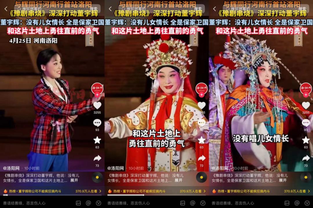 董宇辉正在将文旅直播做成旅游综艺节目,在当天的洛阳行中,董宇辉不仅介绍了当地旅游景点龙门石窟、牡丹园、应天门,和当地工作人员对话聊历史、文学;晚间还安排了多个才艺表演,如爱乐乐团表演的“万马奔腾”,豫剧戏曲串烧《朝阳沟》《花木兰》《穆桂英挂帅》,主播小贝也上台表演了舞蹈,董宇辉在最后也演唱了《烟花易冷》。