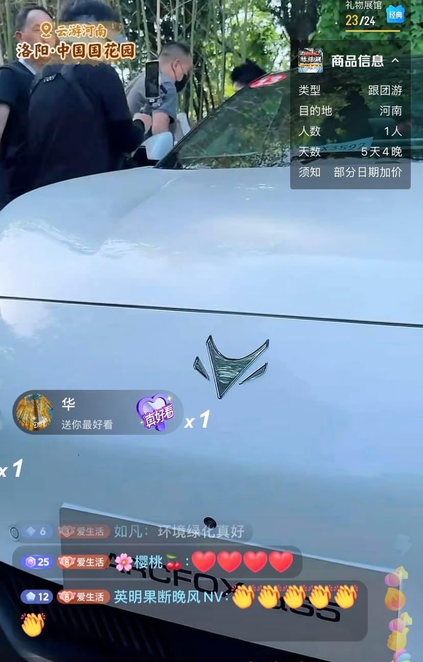当天,董宇辉和主播汉森在极狐汽车上多次互动,如介绍极狐汽车舒适性,使用极狐汽车的语音助手“小狐狸”打开空调、香薰和汽车天幕。在转场中途,直播间多次给了极狐汽车的特写镜头,特别是从牡丹园转场应天门时,一个360度环绕式特写镜头出现在25万观众面前。