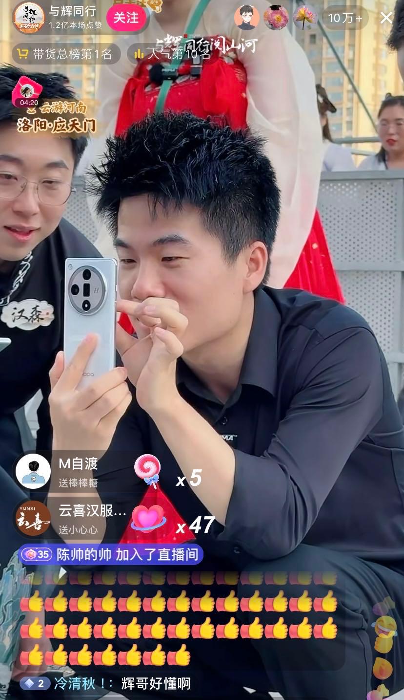 在牡丹园,主播小贝现场使用OPPOFindX7的AI助手“小布”现场做了一首原创的诗。在应天门,董宇辉蹲在地上打开手机摄像,现场拍照,“这广告植入丝滑”,一位直播间观众评论道。