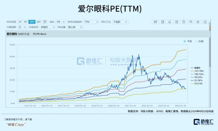 先来看一下当前爱尔眼科的估值水平。根据WIND数据显示,截止2024年4月26日收盘,爱尔眼科PE(TTM)仅为33.82倍,不仅回归至疫情前估值水平,更是处在过往十年中估值中枢下限区间,创历史新低。
