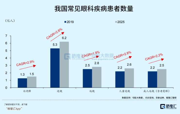 未来,随着人口老龄化趋势加快、学生户外活动时间相对缩减、不科学使用电子产品行为增多等因素的综合作用,我国眼科疾病患者数量有望持续增长。根据华泰证券预测,2025 年我国白内障、近视和远视患者数将分别达到 1.5 亿、6.2 亿和 2.8 亿,其中儿童近视和成人远视(含老花眼)患者数将分别达到 2.6 亿和 2.5 亿,这些眼科疾病患者的就诊需求将长期存在,就诊渗透率有望持续提升。