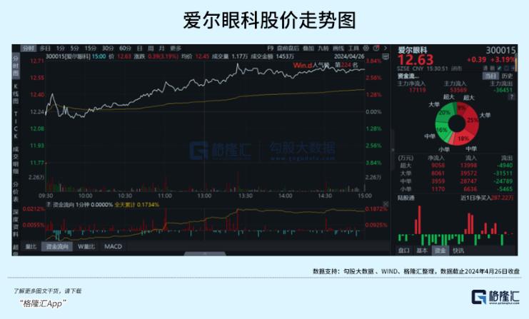 在这一片繁荣景象中,爱尔眼科凭借其不俗的业绩表现脱颖而出。刚刚发布2023年年报以及2024年一季报的爱尔眼科,其成绩单令人瞩目,股价也在当日呈现飘红态势,以3.19%的涨幅完美收官。资金净流入更是达到了1.71亿元,显示了市场对公司的充分认可与看好。
