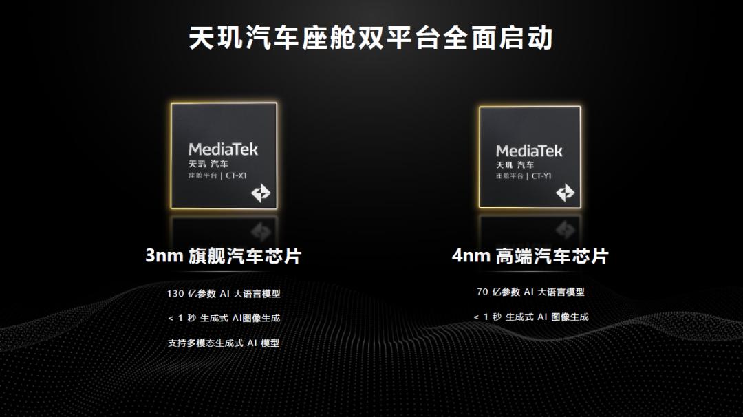 在联发科软硬件的双重优化下,4nm座舱芯片CT-Y1能够在端侧运行70亿参数AI大语言模型,3nm芯片CT-X1则可以支持端侧130亿参数AI大语言模型,目前还没有其他座舱芯片达到这一算力水平。