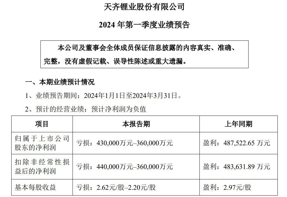 2024年4月23日晚间,天齐锂业发布2024一季度业绩预告,预计亏损36亿元-43亿元。天齐锂业亏损的消息瞬间冲上投资圈的热搜,亏损都见过但像天齐锂业这样亏损的确实罕见。须知2023年公司的归母净利为73亿元,这相当于仅今年一季度的亏损,就将吞噬掉去年全年一半的净利润。