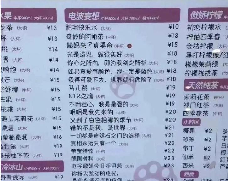 走网文路线的,给奶茶命名初吻、热恋、忘情、解药、手打渣男、原谅绿;