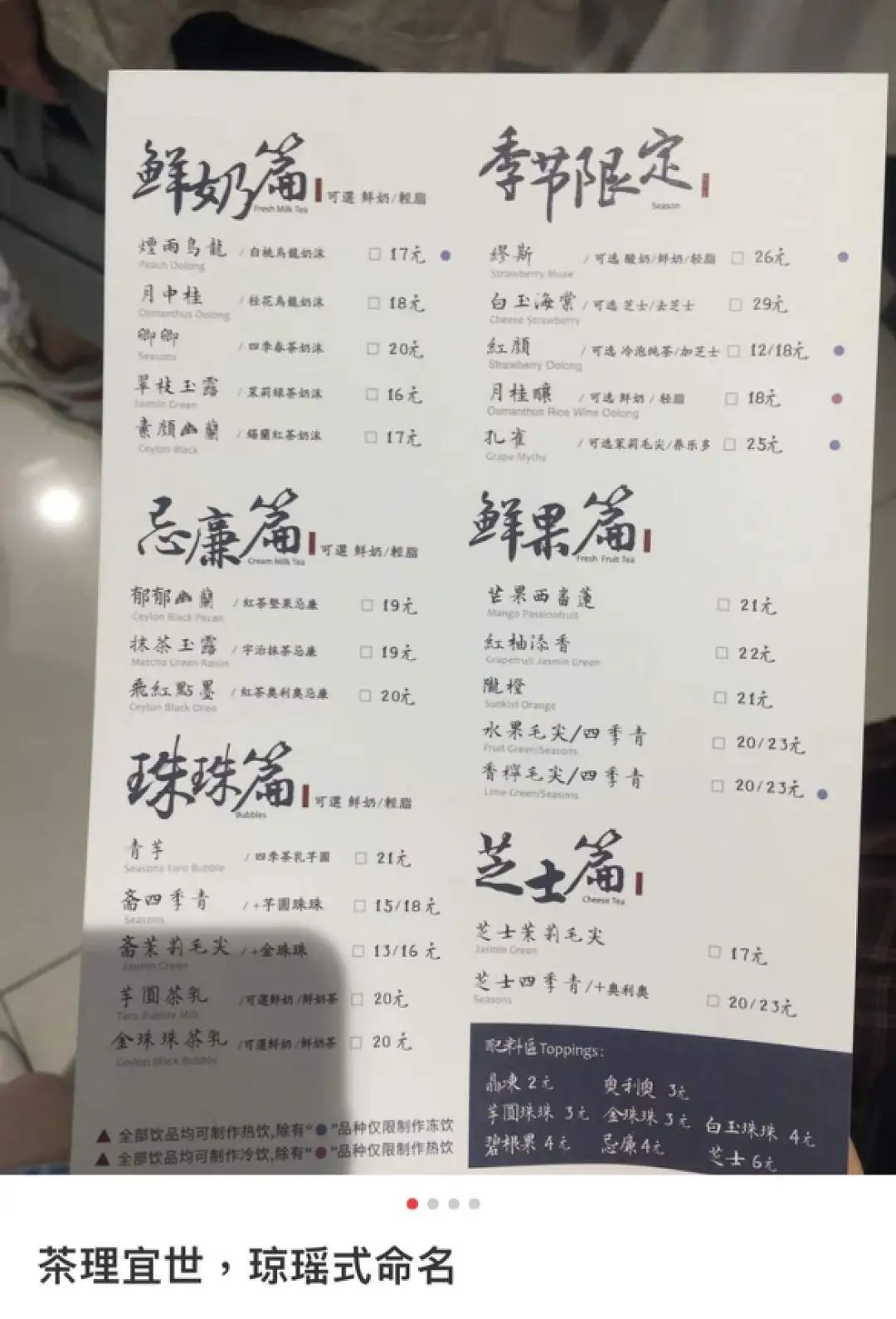 偏爱琼瑶式的,把奶茶名字起为红颜、孔雀、卿卿、白玉海棠;