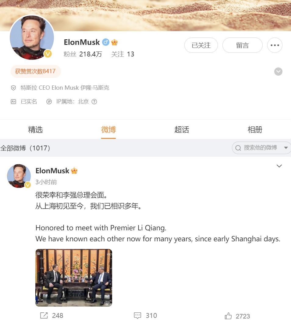 4月28日下午,中国互联网社交平台突然掀起一阵“追星”热潮,而这位明星不是其它人,正是埃隆·马斯克。