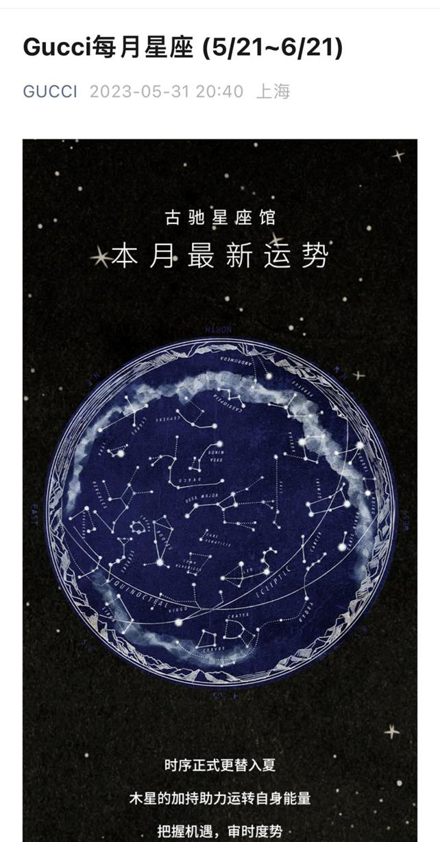 早在2020年,Gucci就在公众号里开通了每月占星专栏,占星师除了分析运程,还会自然地将自家产品植入到星座分析中。