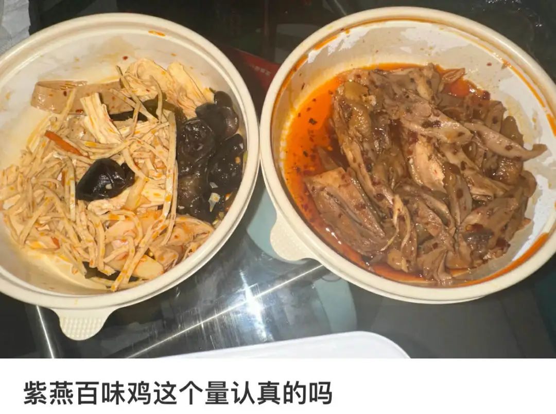 有人猜测,紫燕把盒子越做越小是为了呈现出夫妻肺片装得满当当的效果。又错了,很多网友指出:“一份只有一个盒底才是常态,量少到像是别人的剩饭。”