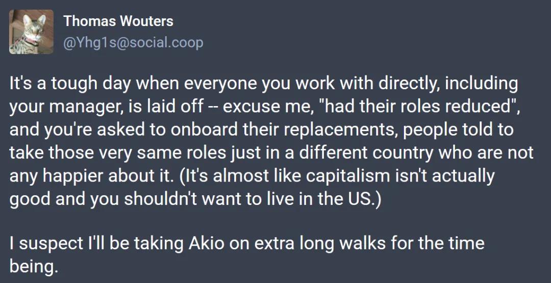 这条动态下,一位业内人士询问 Thomas Wouters 的下一步计划,以及是否需要帮助新员工建立工会等,他回复道:“新团队在慕尼黑,他们有一个工作委员会,我们已经通知了那里的相关人员。现在,我一边想办法为老团队做些什么,一边尽量不给他们添麻烦。”