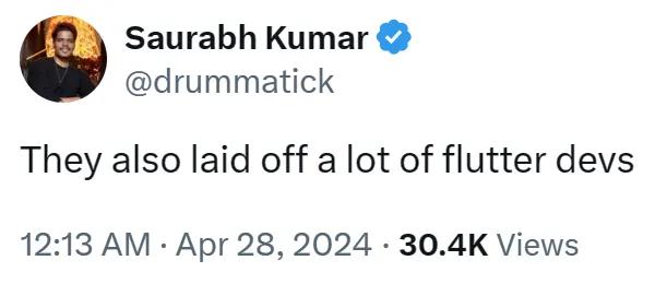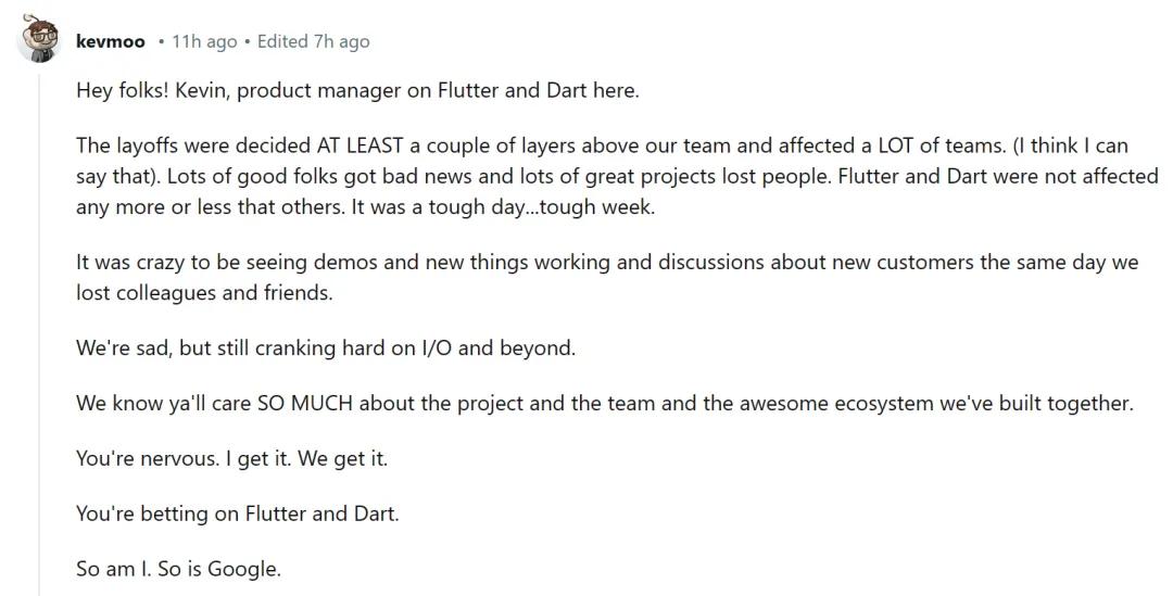 除了 Python 基础团队,据说谷歌的 Flutter 团队也没能逃过这波裁员。