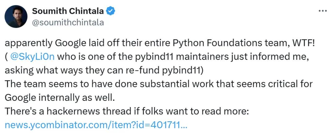 其中,Meta 杰出工程师、PyTorch 之父 Soumith Chintala 表示大为不解:“谷歌裁掉了整个 Python 基础团队,WTF!这个团队似乎已经完成了很多对谷歌内部也至关重要的工作。”