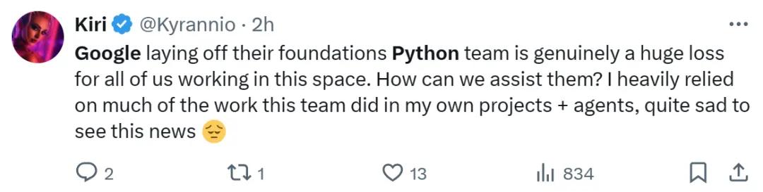 因此很难料想到:在如此坚定投入 AI 的背景下,谷歌突然解雇了整个 Python 基础团队?!