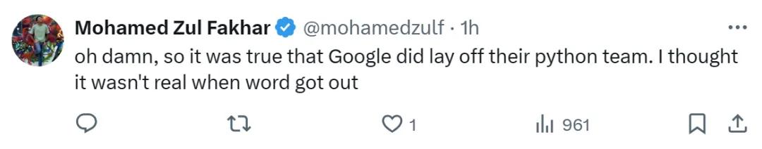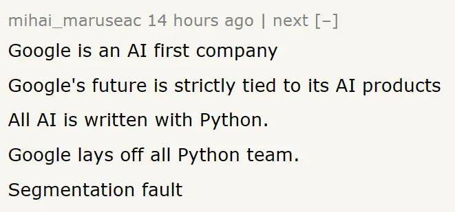 在此,借用 HackerNews 上一位网友的锐评:“谷歌是一家 AI 至上的公司;谷歌的未来与其 AI 产品紧密相连;所有 AI 都是用 Python 写的;而谷歌解雇了整个 Python 团队。”