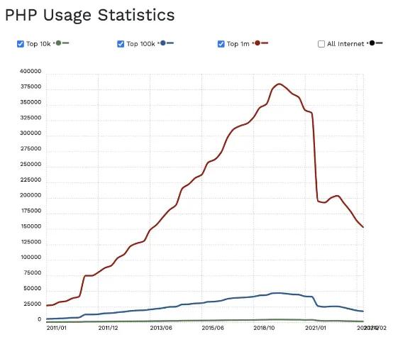 这种下滑趋势在 BuiltWith 上体现得尤其明显,自 2020 年底以来 PHP 的流行度增长线开始断崖式跌落。
