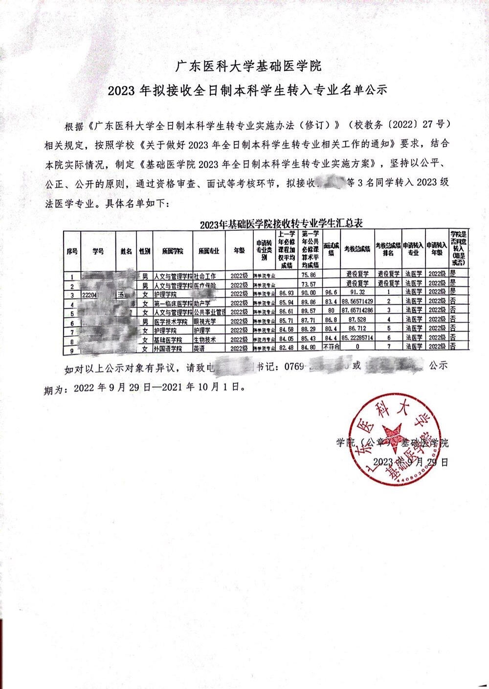 汤玲中成功转专业的公示,受访者供图