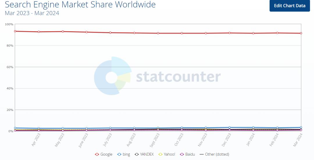 具体来说,谷歌搜索整体市场份额从2023年3月的93.21%下降到2024年3月的91.38%。Bing从2023年3月的2.86%上升到2024年3月的3.35%。