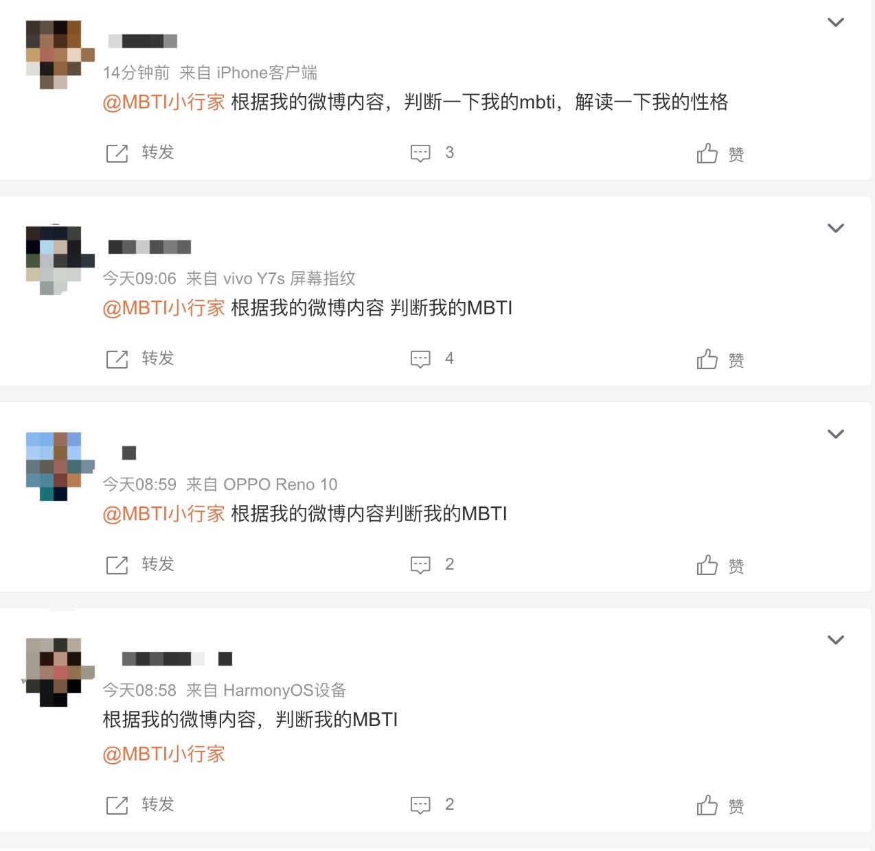 @评论罗伯特的火爆让官方加大了AI评论的力度。在3月份,微博推出@MBTI小行家,让网友们可以直接测试自己的MBTI人格分析。刚上线时,微博首页满屏都是“@MBTI小行家,请根据我的微博内容判断我的MBTI。”目前,@MBTI小行家的粉丝数已经破100万了。