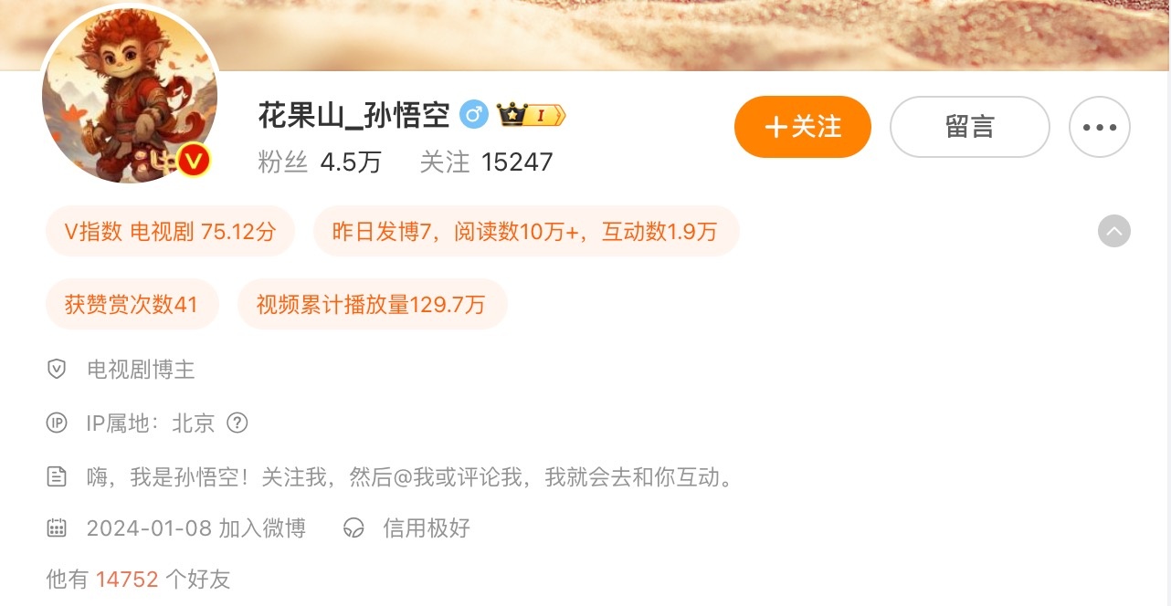 据PConline的统计,目前在AI角色的“家族”中,单个账号粉丝数并不高,最多的一个就是以孙悟空为账号主角的@花果山_孙悟空,目前有4.5w的粉丝,其次是三国系列中的诸葛亮,拥有4.3w粉丝,粉丝数仍在以每日千粉的速度上涨中。这个“家族”共有31w的粉丝。值得注意的是,其中一些账号已经获得了“微博金V”的认证。