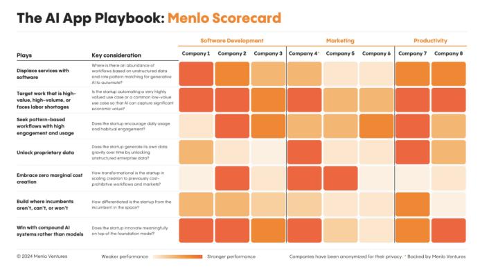 下图显示了我们如何根据 Menlo 的 AI 应用程序手册对 9 个领先应用程序(匿名)进行评分。在下一节中,我们将提供有关每场比赛的更多详细信息,并分享顶尖选手如何使用这些策略获胜的真实故事。