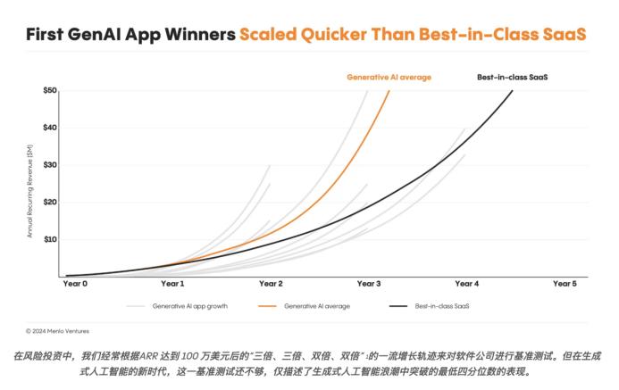 在他们看来,第一批 AI 企业应用正在脱颖而出,与 OpenAI 和 Anthropic 等底层 LLM 厂商的崛起有所区别,它们由 Glean(企业搜索)、EvenUp(法律)和Typeface (内容创建) 等 GenAI 初创公司领衔。
