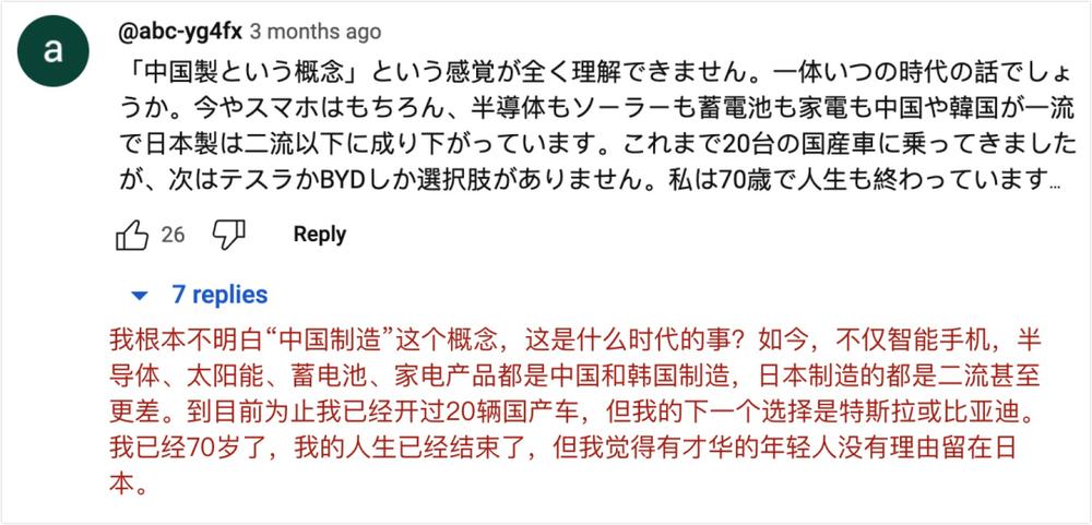 对“中国新能源汽车崛起”的讨论,不断地渗透到日文互联网世界的各个角落,一位70多岁的日本网友还在YouTube的相关视频下,进行了一番对日本制造业的深刻反思。