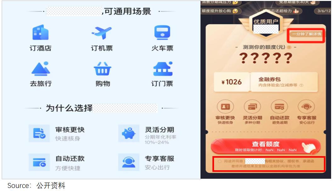 以某OTA平台为例,点进金融服务页面,看到的是审核更快、灵活分期、自动还款等强调贷款授权便捷高效的字眼,关于征信的风险提示,被隐蔽在底部的小字之后。