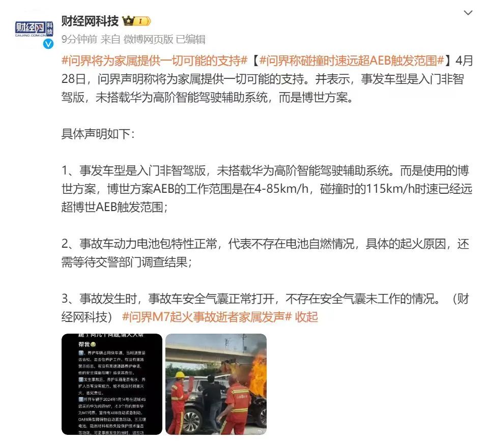 针对山西问界事故,4月28日,问界声明称将为家属提供一切可能的支持。并表示,事发车型是入门非智驾版,未搭载华为高阶智能驾驶辅助系统,而是博世方案。且在公告中明确表示:“博世方案AEB的工作范围是在4-85km/h,碰撞时的115km/h时速已经远超博世AEB触发范围。”