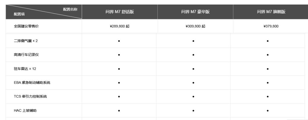 作者查看问界官网得知,问界系列车型,全系标配了AEB,在自动驾驶分级中属于L1级别功能。M7官网中并未提及低配和高配车型所搭载的智能辅助功能如AEB的具体供应链信息,也没有指名是否为非智驾版,与这份公告有出入。只是在自动泊车一栏备注中提到了要“驾驶员仍需时刻关注车辆安全,必要时需随时接管车辆。”