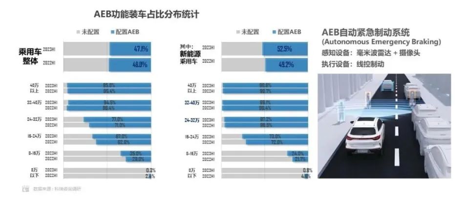 乘联会数据显示,AEB这一功能在 23 年上市的大多新车中已实现全系标配,16 万以上的乘用车型对于 AEB 功能的普及率已达到 67%。绝大部分车企使用博世方案,如丰田、本田、戴姆勒、特斯拉、长安、奇瑞等。