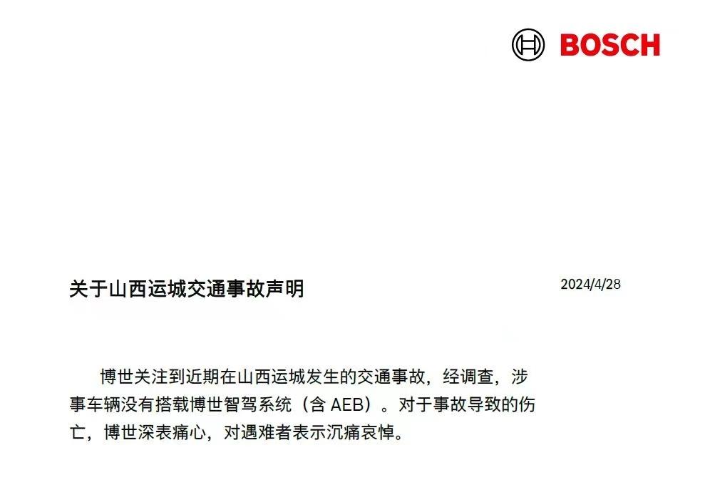 此次面对问界粉丝的质疑,博世公司第一时间也发了一份公告辟谣。公告称此次山西运城事故并未搭载博世的AEB系统,并对遇难者表示哀悼。