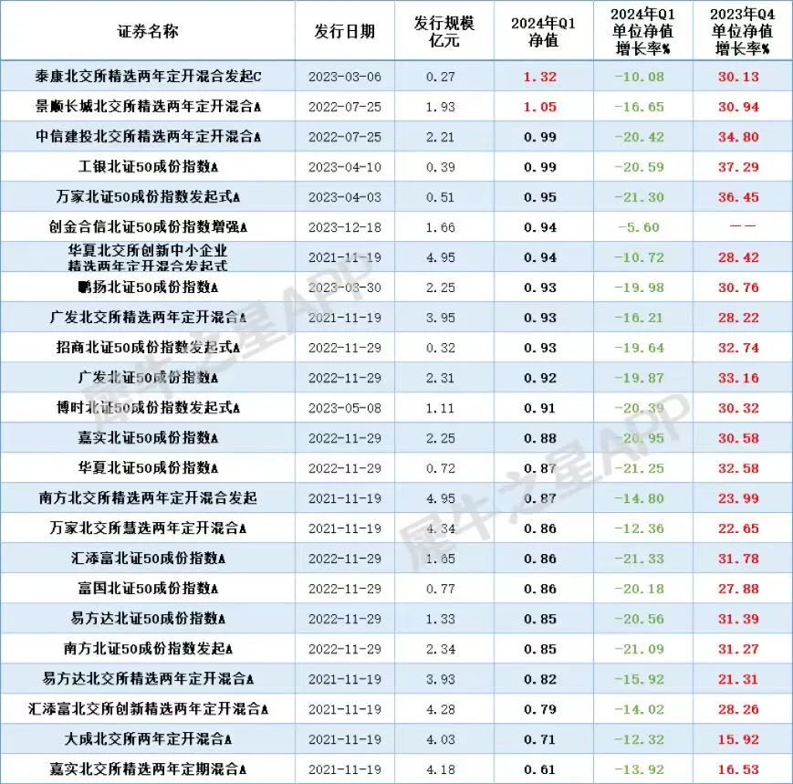 一季度的24家公募基金中,仅剩不到2家净值保持在水上,分别为景顺长城北交所精选两年定开混合A和泰康北交所精选两年定开混合发起C;净值最低的基金则为嘉实北交所精选两年定期混合A,截止一季度末基金净值掉到0.61。