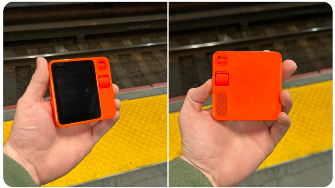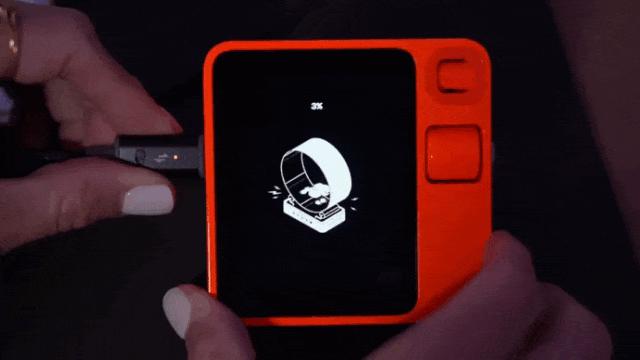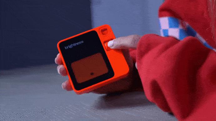 外观上没什么变化,小巧趁手。橙色的外壳包裹着2.88英寸的屏幕和一个可以旋转的摄像头。交互上侧边边有一个灰色按钮以及一个滚轮。设备背面有扬声器开口,底部和侧边还有麦克风、typec充电口和sim卡槽。