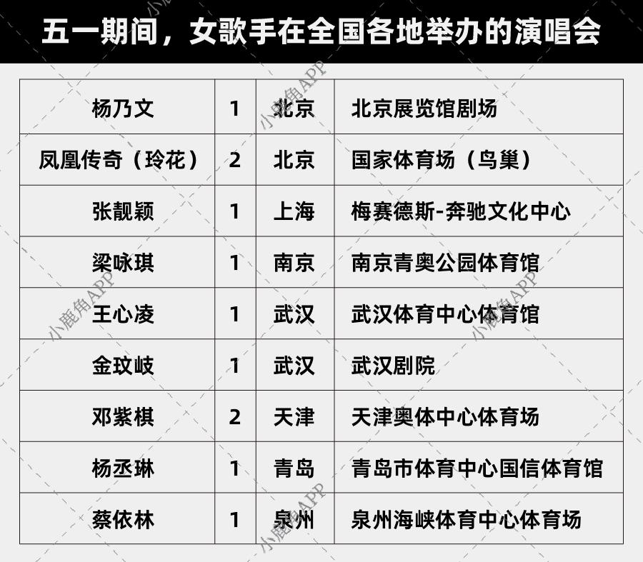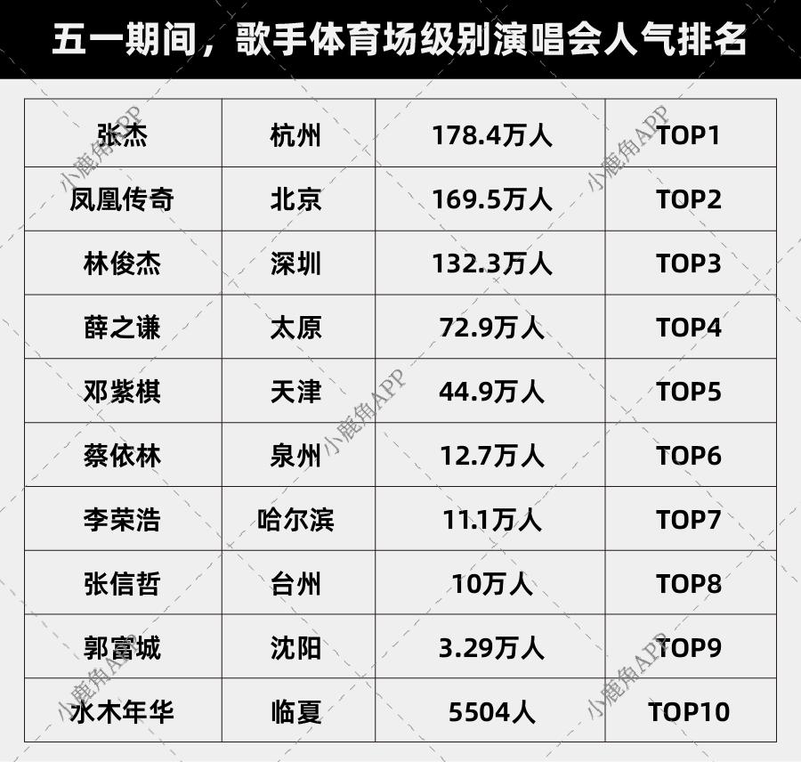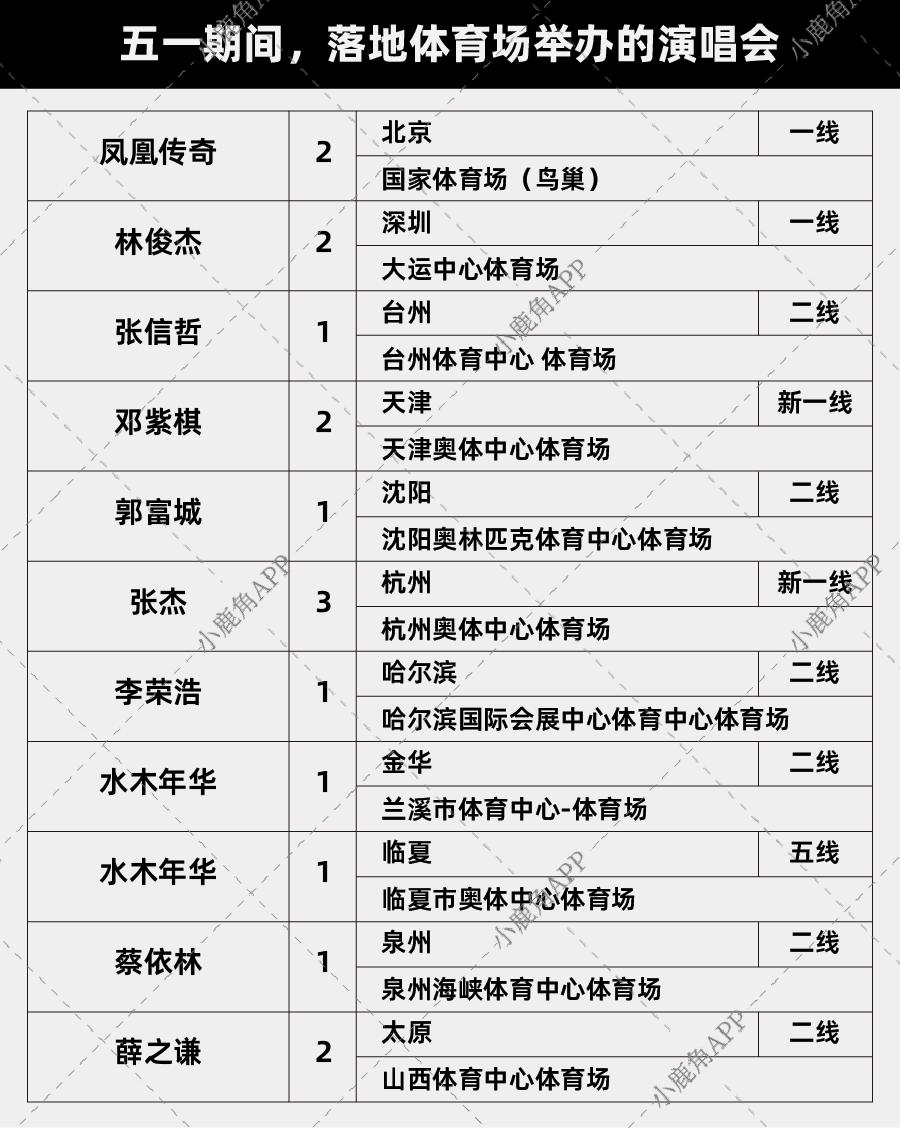 在杭州,五一期间,张杰将连续举办3场体育场级别的演唱会。而凤凰传奇、林俊杰、邓紫棋和薛之谦分别在各地举办2场。从策略来看,水木年华在北京开的是体育馆,虽然人气很低,但到了下沉市场,还是争取开到了体育场级别。
