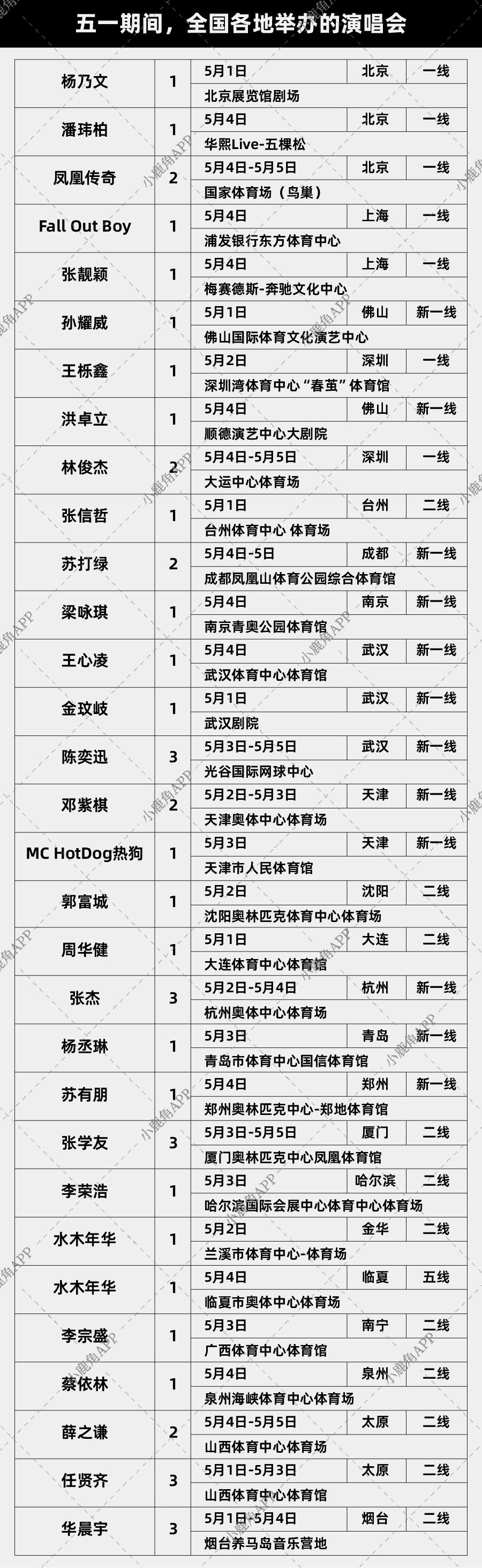 在即将到来的五一黄金周,陈奕迅、王心凌、邓紫棋、张学友、凤凰传奇、潘玮柏、杨乃文、张靓颖、苏打绿、洪卓立、林俊杰、孙耀威等都将在内地各大城市陆续举办大型演唱会,整个五一热闹非凡。