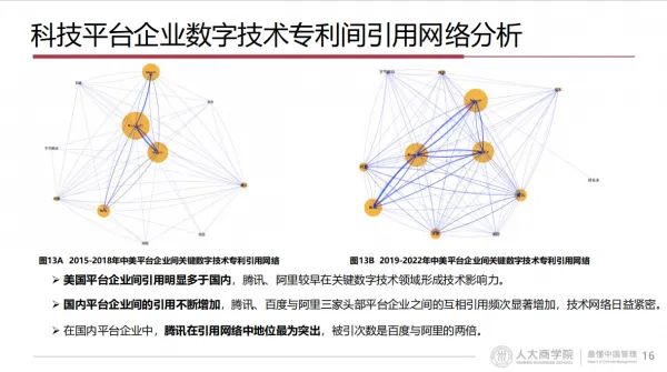 研究中,陈志远利用了网络分析,反映中美两国平台专利的引用体系。陈志远说:“现在国际环境下,全球技术民族主义兴起,但从我们的研究看,过去一段时间中美平台的专利相互的联系变得更加紧密了,变成‘你中有我,我中有你’,在技术的浪潮全世界传播的背景下,不同的科技平台不仅需要自己去创新,也依赖于竞争对手的创新。”