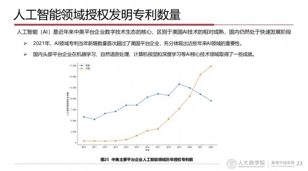 以人工智能为例,人工智能是近年来中美平台企业数字技术生态的核心,区别于美国人工智能技术的相对成熟,国内仍然处于快速发展阶段。2021年,中国人工智能领域专利当年新增数量首次超过了美国平台企业。