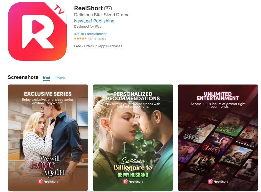 2022年8月,中文在线海外子公司枫叶互动——Crazy Maple Studio在美国上线了Reel Short平台。据《报告》显示,该平台贡献了短剧出海赛道52%的下载量和48%的收入,占据半壁江山。