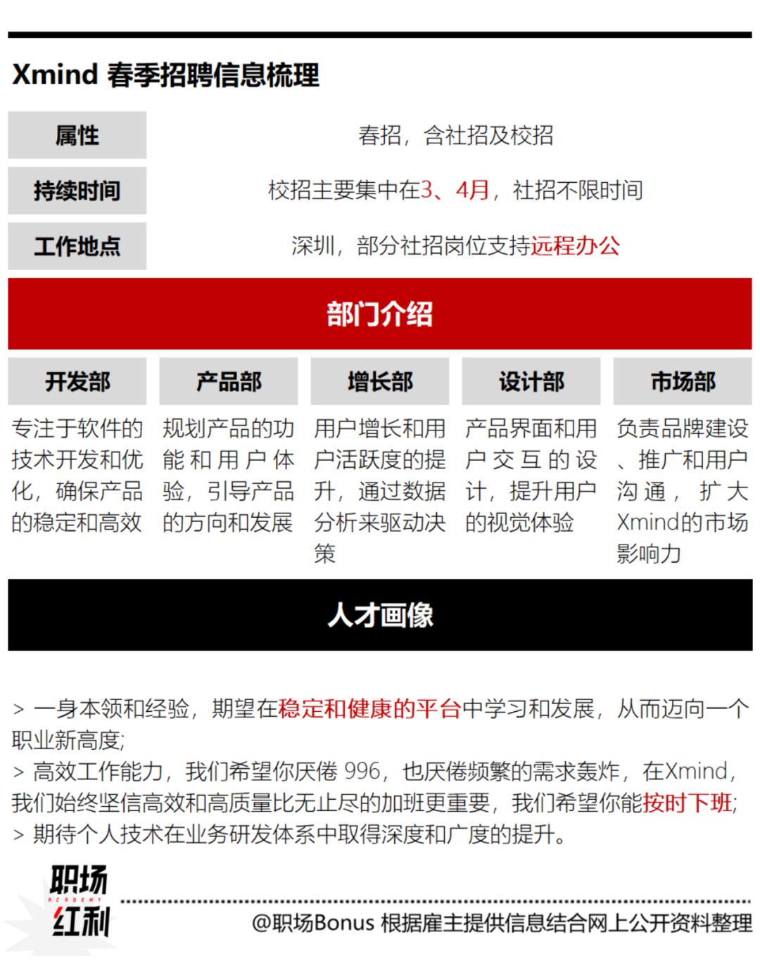 职场Bonus获悉,思维导图与头脑风暴软件开发商「Xmind」2024年春季招聘正在进行。招聘职位涉及的重点部门为开发部、产品部、增长部、设计部和市场部,AI相关人才是招聘重点,“支持远程办公”则为其招聘的一大亮点。