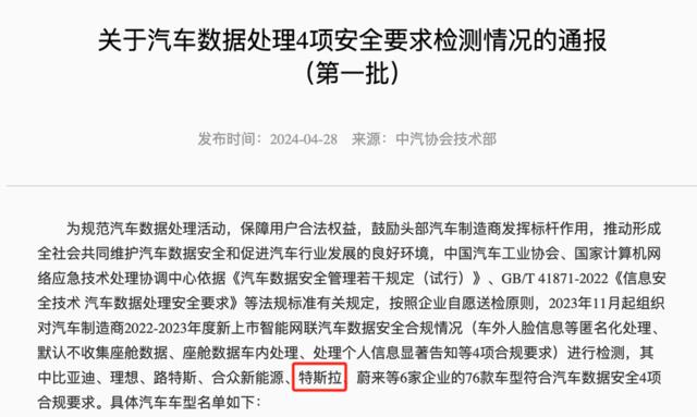 特斯拉在中国通过了一项监管里程碑。中国汽车工业协会、国家计算机网络应急技术处理协调中心发布《关于汽车数据处理4项安全要求检测情况的通报(第一批)》,特斯拉上海超级工厂生产的车型全部符合合规要求。特斯拉因此成为首批获得国家权威的车辆数据检测的企业,更是唯一一家符合合规要求的外资企业。因此,各地已经陆续解除了对特斯拉的禁停进行要求。